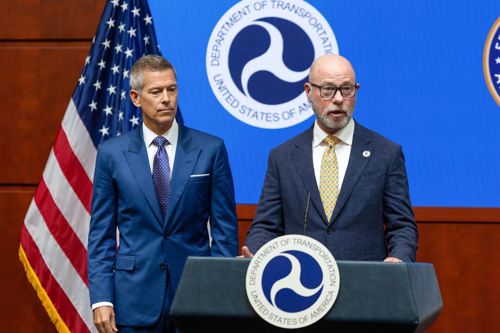 Ông Bryan Bedford (phải), giám đốc FAA, và Bộ Trưởng Giao Thông Sean Duffy tại cuộc họp báo hôm Thứ Tư, 5 Tháng Mười Một, thông báo giảm 10% các chuyến bay. (Hình: Tasos Katopodis/Getty Images)