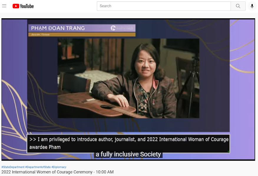 Tấm hình này phổ biến trên YouTube nhân dịp bà Phạm Đoan Trang được Bộ Ngoại giao Mỹ vinh danh năm 2022 là một trong những phụ nữ can đảm trên thế giới. (Hình: YouTube)