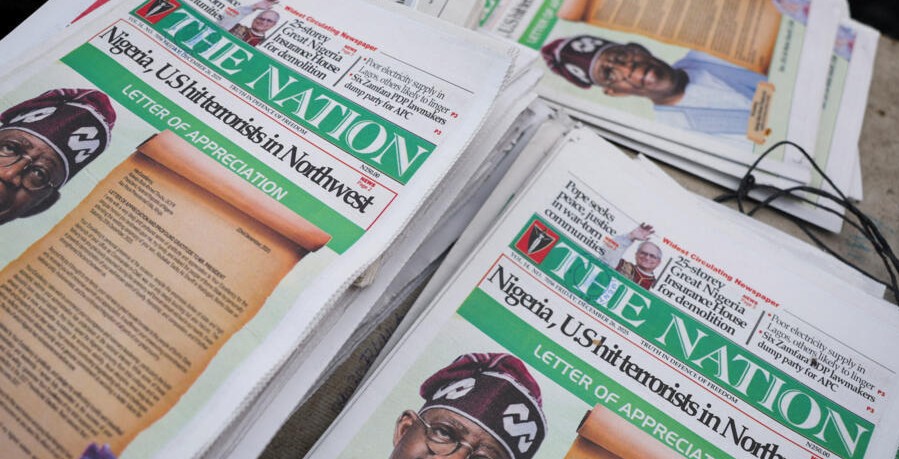 Tại một sạp báo ở Lagos, Nigeria, ngày 26/12/2025: Trang nhất của các báo đưa tin về những cuộc không kích của Mỹ nhắm vào các phần tử Nhà nước Hồi giáo tại Nigeria. REUTERS – Sodiq Adelakun