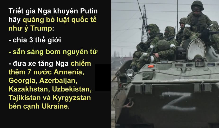 Triết gia Nga khuyên Putin hãy quăng bỏ luật quốc tế như ý Trump: chia 3 thế giới, sẵn sàng bom nguyên tử, đưa xe tăng Nga chiếm thêm 7 nước Armenia, Georgia, Azerbaijan, Kazakhstan, Uzbekistan, Tajikistan và Kyrgyzstan bên cạnh Ukraine.