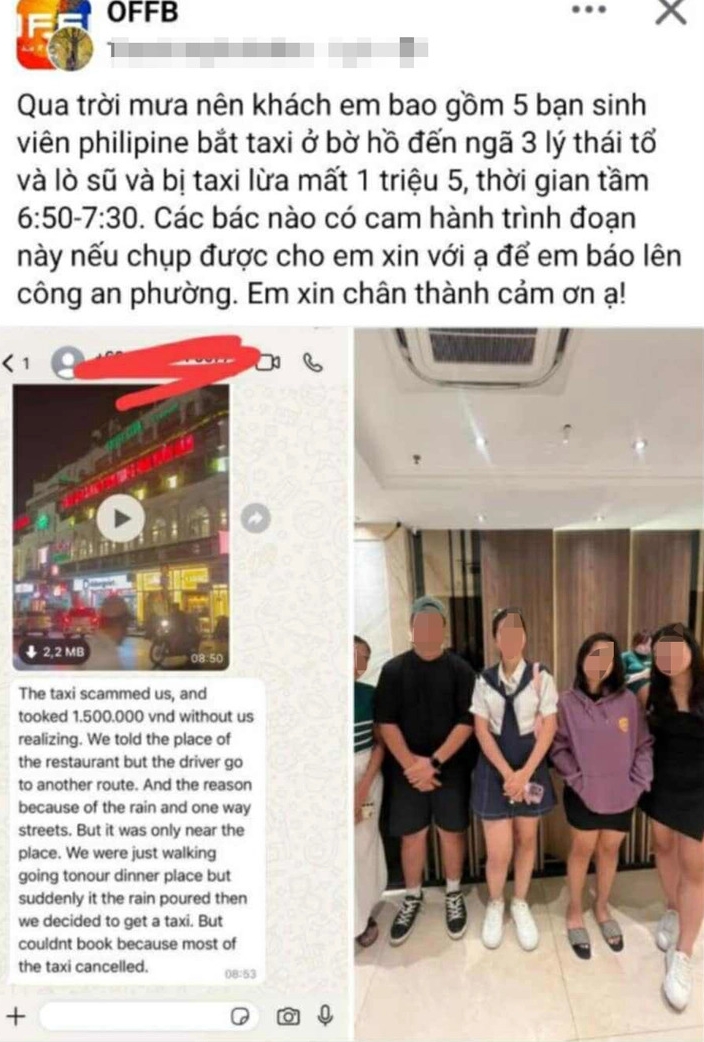 Bài đăng của nữ hướng dẫn viên du lịch trên mạng xã hội tố việc nhóm khách Philippines bị taxi ở khu vực hồ Hoàn Kiếm, Hà Nội, “chặt chém.” (Hình: Tuổi Trẻ)