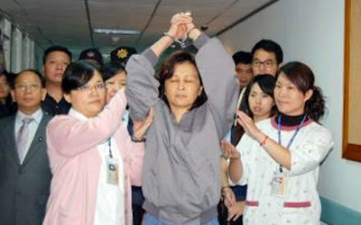 Hình 2: Bà Tô trị Phần đang giơ cao hai tay bị còng để phản đối khi bị đưa lên một xe cảnh sát đến cơ quan công tố để thẩm vấn (Ảnh chụp ngày 10/11/2008)