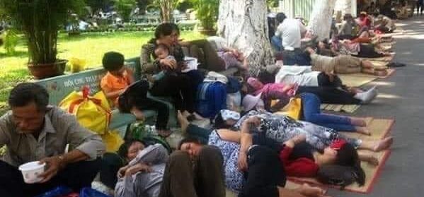 Số người chờ khám cho thân nhân hay chờ khám cho chính mình nhiều hơn số giường của bệnh viện có, nên người chờ đợi, ăn, ngủ, tràn lan ra tới hành lang.