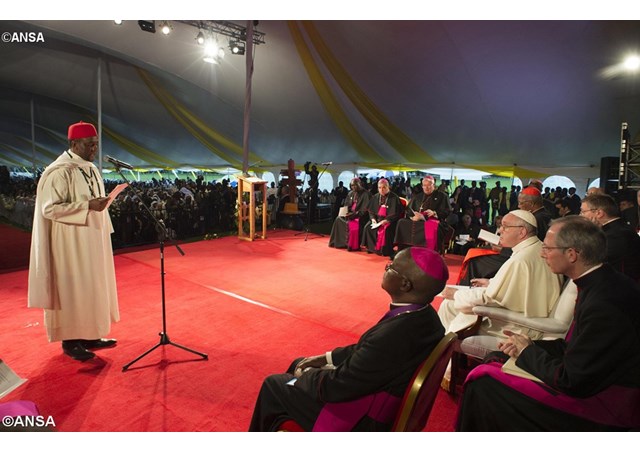 Cuộc gặp gỡ của ĐTC với các LM, tu sĩ và chủng sinh, diễn ra sau buổi phụng vụ Lời Chúa: trước tiên là lời chào mừng của Đức Cha Anthony Ireri Mukobo, Chủ tịch Ủy ban GM Kenya về giáo sĩ, tu sĩ. Rồi đến chứng từ của Cha Felix Phiri, Chủ tịch Hội đồng các nam Bề trên và nữ tu Michael Marie Rottinghous, chủ tịch Hội đồng các nữ tu Kenya.