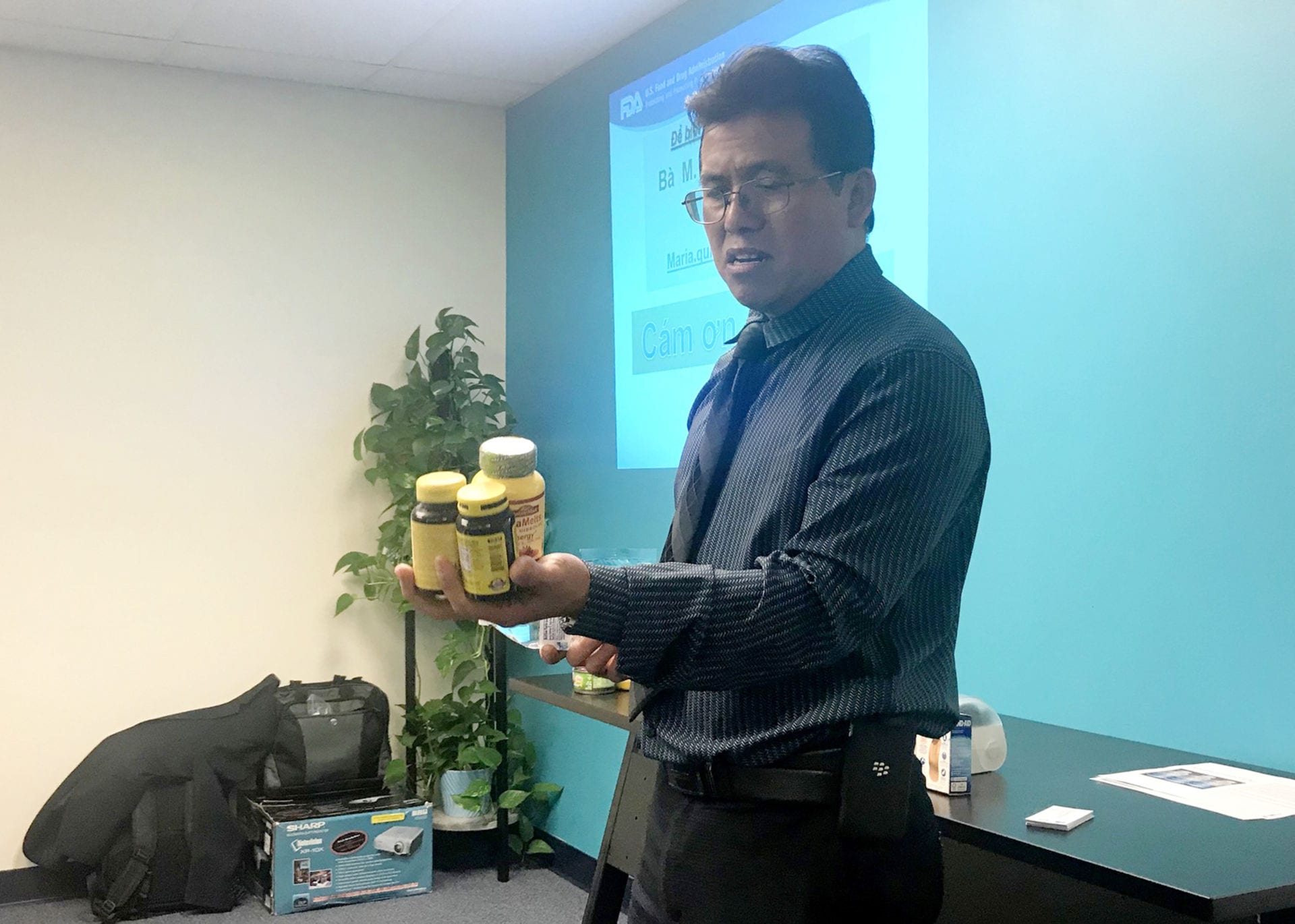 Ông Lê Viên, chuyên viên FDA phụ trách khu vực 5 ở Orange County, thuyết trình chỉ rõ sự khác nhau giữa nhóm thuốc chữa bệnh có toa, thuốc chữa bệnh không cần toa và thực phẩm chức năng. (Hình: Tâm An/Người Việt)