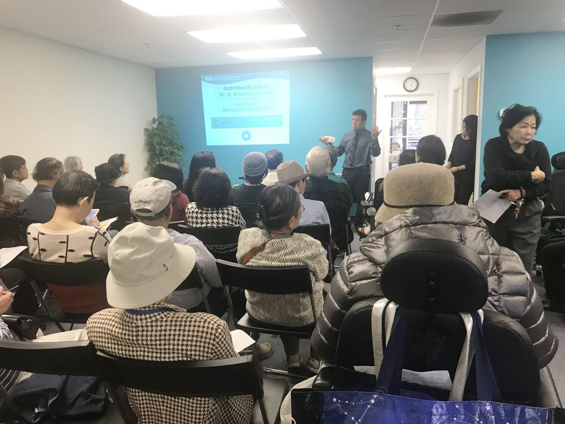 Hội trường nhỏ của Hội Ung Thư Việt Mỹ chật kín người nghe, trong đó đa phần họ là bệnh nhân ung thư. (Hình: Tâm An/Người Việt)