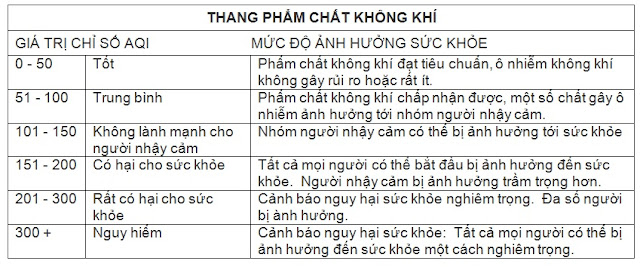 Chỉ số về phẩm chất không khí – Air Quality Index, viết tắt là AQI, cho biết không khí tại vùng đo được còn sạch hay ô nhiễm, và ảnh hưởng tới sức khỏe con người như thế nào. Chỉ số này được biểu thị qua 6 mức độ. Con số càng cao thì mức ô nhiễm càng trầm trọng: